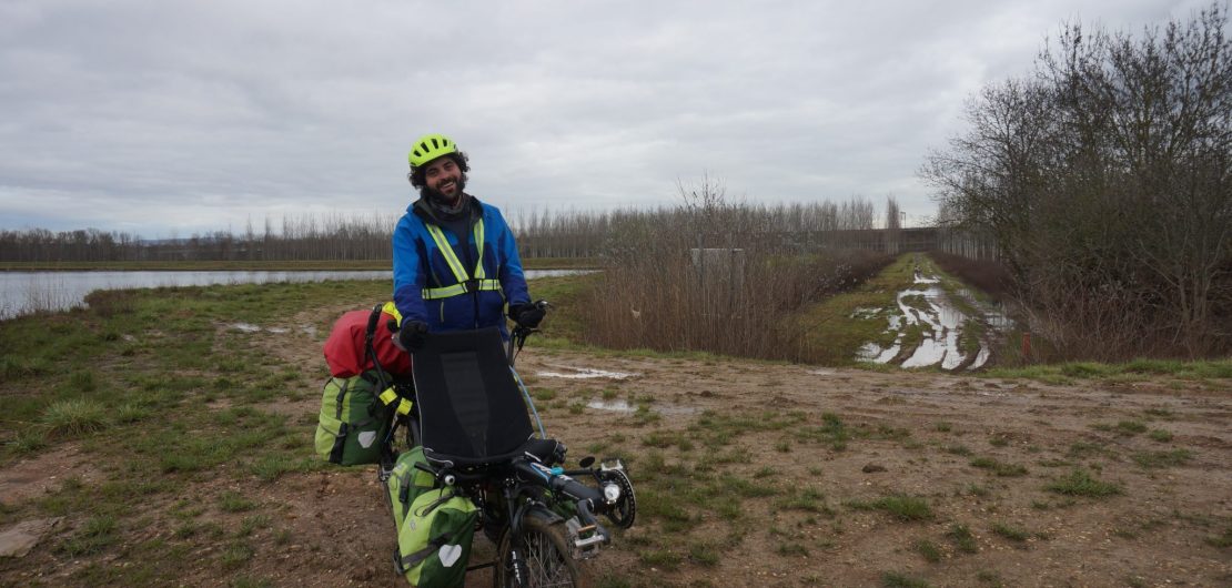 A la sortie de la ville, on rejoint la voie vélo, on est sur un chemin le long des berges, on avance bien. On tourne un peu trop tôt, ce n’est pas grave, il suffit de tourner au prochain chemin à droite pour rejoindre le chemin principal. Sauf que le chemin en question est plein de boue… On a la flemme de faire 1/2 tour (1ère erreur de la journée), on décide de pousser le vélo sur les 200m avant de rejoindre le bon chemin. On pousse, on glisse, on manque de tomber dans la boue… et avec un dernier effort, on pousse le vélo jusqu’au chemin !