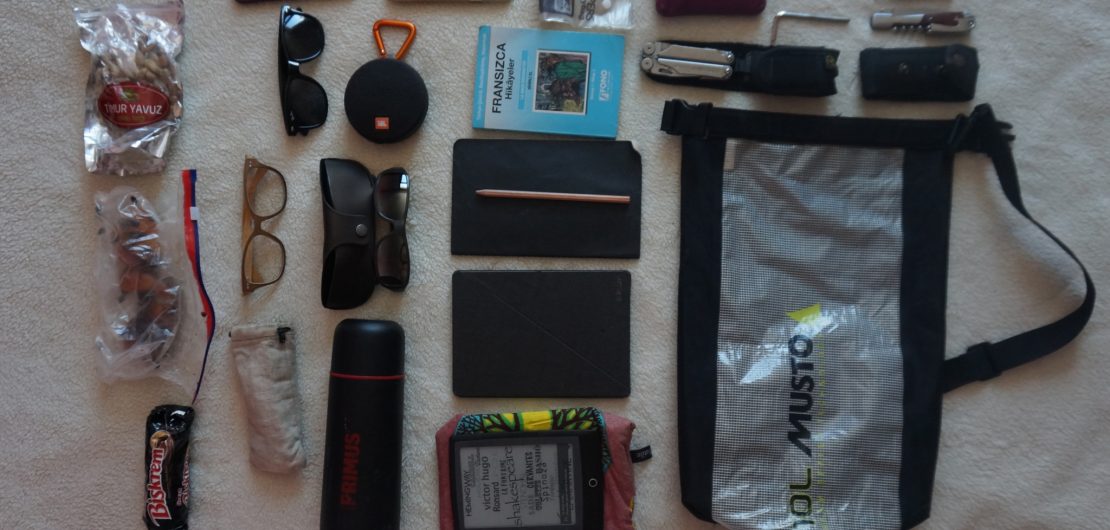 Nous avions prévu ce petit sac pour y faire notre lessive (on voulait copier le concept de ce sac hors de prix). Finalement, on ne l’aura que très peu utilisé pour ça, il nous sert quand même tous les jours ! On y met toutes les petites choses dont on a besoin au cours de la journée : liseuses, thermos, porte-monnaie et téléphone en cas de pluie, en cas (petits gâteaux, fruits, fruits secs…), couteaux, lunettes…