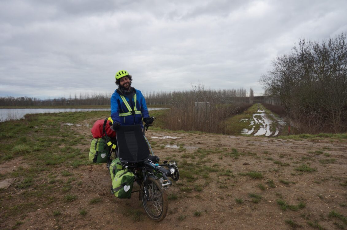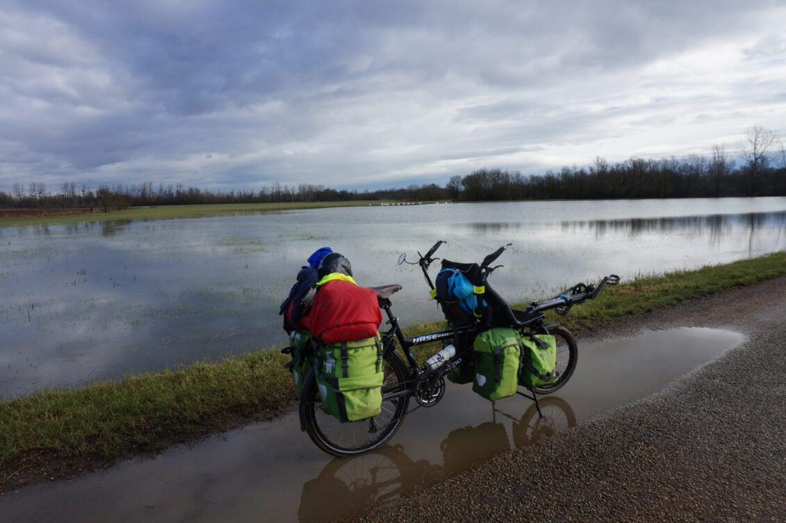 A la sortie de la ville, on rejoint la voie vélo, on est sur un chemin le long des berges, on avance bien. On tourne un peu trop tôt, ce n’est pas grave, il suffit de tourner au prochain chemin à droite pour rejoindre le chemin principal. Sauf que le chemin en question est plein de boue… On a la flemme de faire 1/2 tour (1ère erreur de la journée), on décide de pousser le vélo sur les 200m avant de rejoindre le bon chemin. On pousse, on glisse, on manque de tomber dans la boue… et avec un dernier effort, on pousse le vélo jusqu’au chemin !