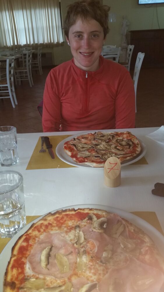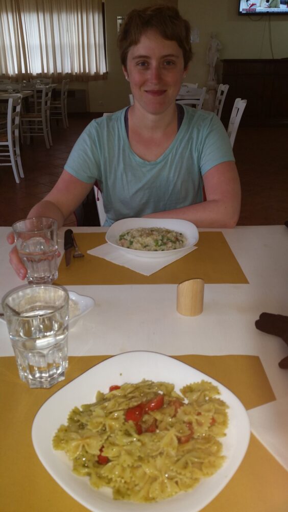 On est totalement trempés, donc on optera pour un déjeuner au sec dans une osteria et une nuit au sec à Arezzo… Le déjeuner nous a fait forte impression, primi (des pâtes) et secondi (une pizza), on se demande bien comment font les italiens pour manger autant à chaque repas !!