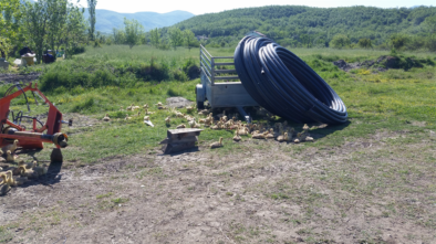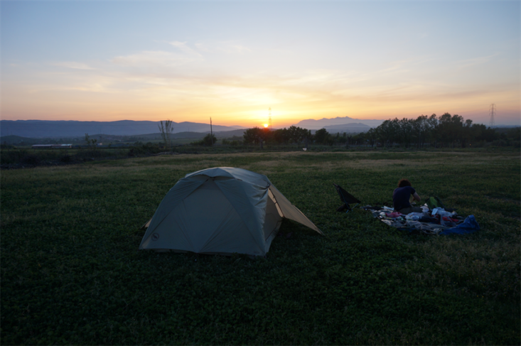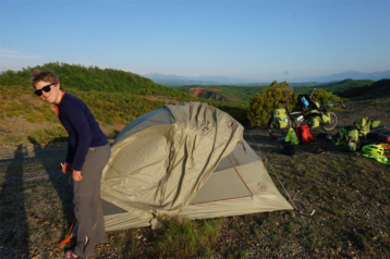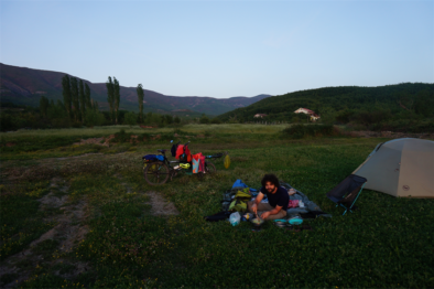 En parlant de la nuit, on trouve un petit coin d’herbe auprès d’un restaurant plutôt cossu qui nous a très généreusement permis de rester dans leur ferme. Le propriétaire est ravi de nous voir et nous fait même poser pour un journaliste local justement présent pour recueillir de quoi écrire un article ! Stéphanie, la tente et le vélo devraient donc apparaître dans une publication albanaise prochainement, stay tuned 😉