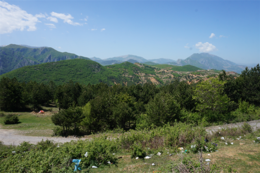 Nous arrivons à Klos, de nouveau une ville plutôt grande comparée à la rue unique qui semble la composer d’après openstreetmap… Avis aux adeptes du tracé de polygones, il y a de quoi faire en Albanie ! Nous y rencontrons même une américaine très sympa avec qui je discute quelques minutes.