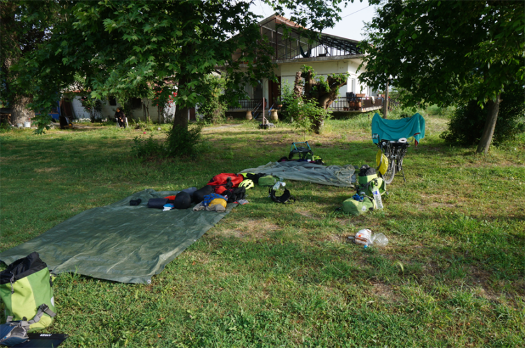 Un soir, on installe notre tente sous le porche d’une église après avoir eu la confirmation que ça ne posait pas de problème (on devient des pros du repérage de préaux pour éviter que la tente ne soit mouillée au réveil !). Une voiture ralentit à notre niveau, fait marche arrière et s’arrête. J’y vais en commençant à nous justifier : on est à vélo, il n’y a pas d’hôtel dans le coin, on part dès demain matin… La femme dans la voiture m’arrête et me demande si on a besoin d’aide, si elle peut faire quelque chose pour nous, si on a bien à manger… Je la rassure, on a tout ! Une demi-heure plus tard, elle revient avec 2 gros sacs plastiques à la main : elle nous apporte dîner (chaud !), croque-monsieur, croissants, eau, jus de fruits… Incroyable !!!