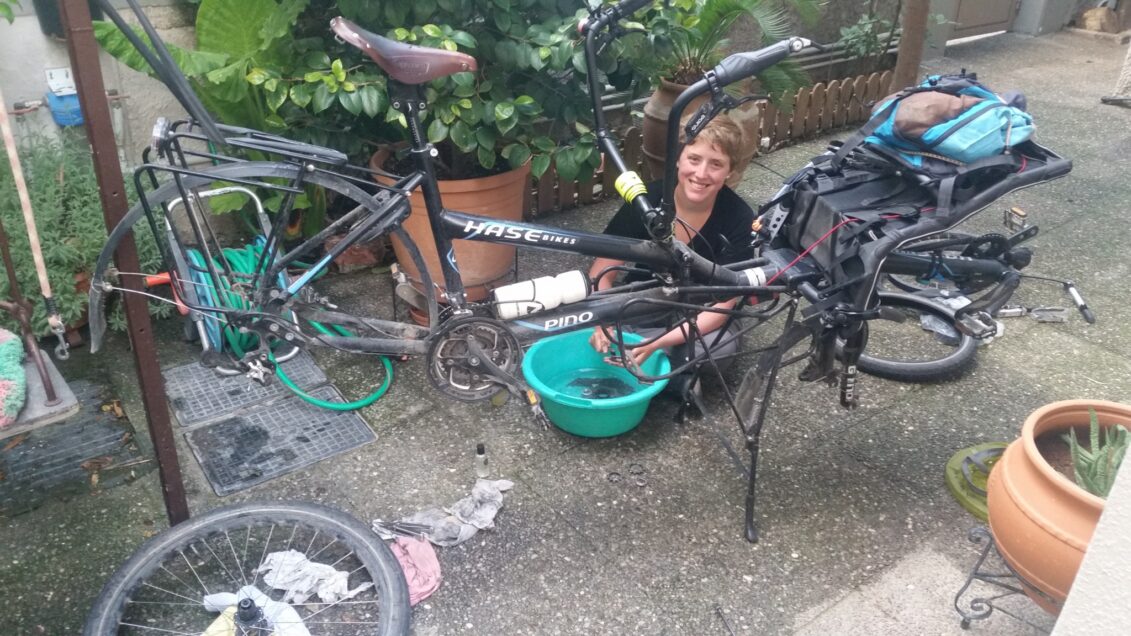 Dernière chose importante de ce séjour à Athènes : la révision complète de notre vélo ! On fait ça tous seuls comme des grands : on change la chaîne arrière, on nettoie/graisse tout le vélo (victoire, la roue libre se remet à faire un bruit “agréable”), Claude règle les vitesses… on a même un pneu avant tout neuf que l’on changera dès que notre pneu actuel finira sa vie (il en n’est pas loin…). Bon, à l’heure où j’écris ces lignes, notre nouvelle chaîne ne semble finalement pas si optimale, Claude est sur le coup !