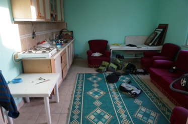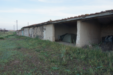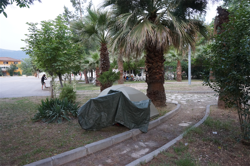 La suite de l’itinéraire ne nous amuse guère : encore 20km sur cette grosse route avec aucune alternative… On tente le stop sans succès, on n’arrive pas non plus à trouver de bus adéquat. Résignés, on s’apprête à repartir quand on réalise quand on a traversé plusieurs fois des rails depuis ce matin, on trouve la gare, un train part demain matin pour Dinar, parfait ! On essaie de négocier l’installation de la tente sous le auvent de la gare, ça ne marche pas. On fait le plein d’eau et on se dirige vers la sortie de la ville. Une femme nous prend en photo depuis son jardin, on fait 1/2 tour et on lui demande si elle connait un endroit où l’on peut planter la tente. Son mari arrive, il passe un coup de fil et nous emmène à un parc caché de la route. On était passés devant sans le voir, il a appelé la mairie et les gendarmes, il n’y a pas de soucis, on peut y passer la nuit ! Il y a de l’eau et des toilettes que l’on peut utiliser dans un grand bâtiment public à côté, parfait !