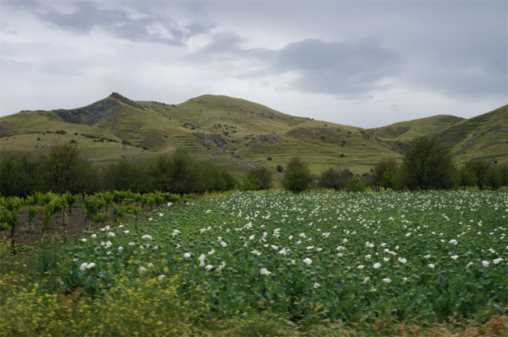 Puis on attaque une belle montée. On passe de micro-villages en micro-villages sans voir ni restau ni épicerie comme on en a l’habitude. A l’heure du déjeuner, Claude demande à un employé de banque (groupama semble ultra présent pour les coopératives agricoles) s’il y a manger quelque part dans le village. Il nous amène un thé, nous dit de ne pas bouger et part. Il revient quelques minutes plus tard avec son fils et nous fait signe de le suivre. On est en fait invités à déjeuner chez lui !! On rejoint sa maison sous le tonnerre, et un tel déluge qu’on est obligés de s’arrêter à mi-chemin pour éviter les gros grêlons qui nous tombent dessus.  On passe un super moment avec sa famille, Claude gère le turc et on arrive à avoir de petites conversations. On apprend ainsi que la plupart de ces villages sont (quasi) déserts l’hiver pour fuir les hivers rigoureux. Les habitants redescendent dans la vallée et ses villes. Cette famille a ainsi 2 maisons. On croise pas mal de camps avec de grandes tentes le long de nos routes ainsi que des mini-bus qui transportent des travailleu.ses.x aux champs (il y a aussi des femmes cette fois), on devine que ce sont des personnes qui n’ont pas les moyens d’avoir 2 maisons (hypothèse à confirmer cependant).