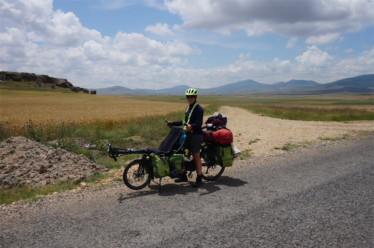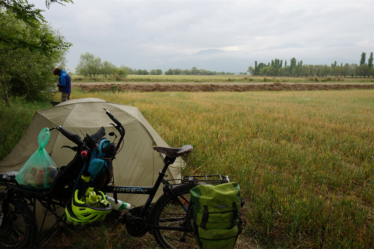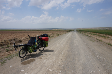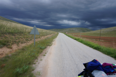 On attaque la descente, on arrive dans une magnifique vallée, les blés brillent et ondulent sous l’effet du vent (à voir dans la vidéo ci-dessus), il y a une espèce de gros tas de cailloux rouges, on espère que ce n’est pas le terrier du chien, il serait vraiment gros… En fin d’aprem, toujours pas de chien en vue, un orage approche, on pousse un peu sur les pédales, on n’a pas vraiment envie d’être dessous au milieu de plaines… On croise un mini village, un paysan rentre ses vaches, il nous parle en français ! On traverse le troupeau, une vache nous observe, curieuse, elle avance vers nous puis… court vers nous ! Mais elle ne serait pas en train de nous charger ?! On accélère, on la distance et elle finit par s’arrêter en poussant un terrible meuglement… On n’aura pas rencontré le terrible köpek mais on aura eu notre dose de gros animal méchant ! Après une bonne journée, on atteint un village où l’on trouve un garage abandonné où l’on peut s’abriter de l’orage. On voit des éclairs qui illuminent toute la vallée, c’est magnifique ! (et ce, surtout quand on est au sec !)