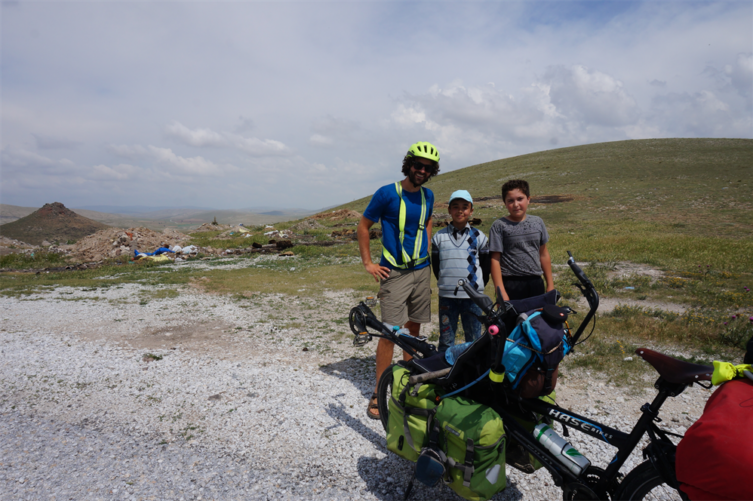 Sur la place, plusieurs personnes nous mettent en garde, “köpek köpek”, si on veut continuer dans la direction prévue (où l’on sait qu’il y a au moins 30km sans aucun village), il faudra affronter le… chien (köpek en turc) ! On ne sait pas vraiment s’il y en a un ou plusieurs et où il sera/sont mais ce qu’on a bien compris, c’est que c’est un gros chien agressif qui semble terroriser tout le village. Ni une ni deux, Claude réalise le pistolet à eau qu’on n’a toujours pas acheté (voir épisode précédent) en perçant le bouchon d’une bouteille. Un turc nous fait signe que notre arme de niveau 1 ne sera clairement pas suffisante contre ce chien de niveau 12, il va nous chercher un énorme bâton. On prend notre courage à 4 mains, je m’installe avant avec d’une main la bouteille, l’autre le bâton. On a l’impression d’aller voir le boss final d’un jeu vidéo ! Des enfants nous accompagnent pendant la montée, on se dit que le chien doit être un peu plus loin.