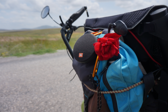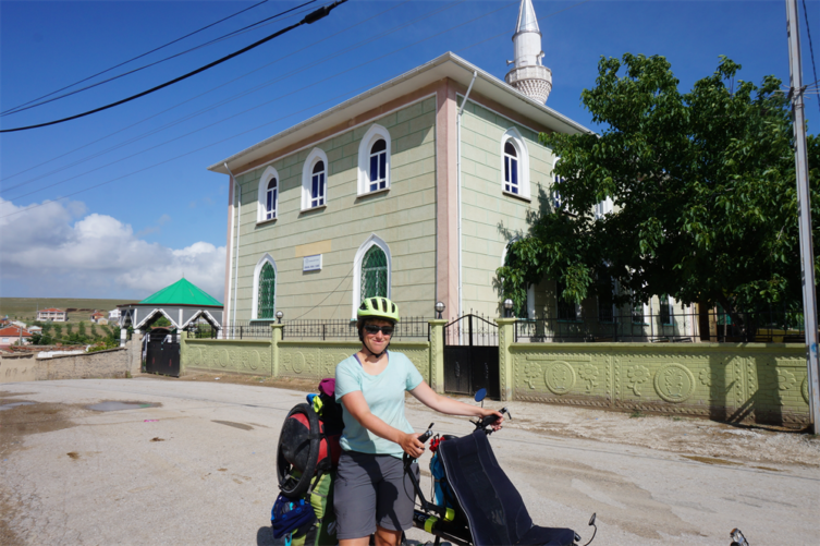 On repart pas très sereins avec l’orage qui semble s’éloigner. On guette régulièrement les cumulonimbus, on aperçoit de plus en plus d’éclairs. On fait une pause dans un village, les hommes sortent de la mosquée. On se ravitaille à l’épicerie du coin, je paie une broutille, l’un d’entre eux nous a en fait offert discrètement nos courses (on le voit payer l’épicier un peu plus tard). Ils nous demandent où on loge et nous invitent à la mosquée. Là, c’est le luxe ultime, on est accueillis dans un appartement, la femme de l’imam nous apporte une délicieuse soupe et surtout… on prend une vraie douche… chaude !! Décidément, quelle incroyable journée !! On repart requinqués avec une belle rose au guidon offerte par la femme de l’imam.