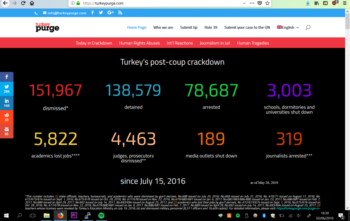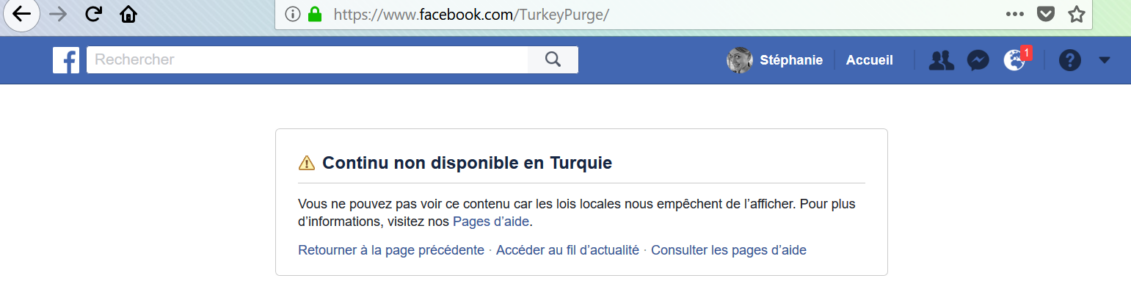 A ce sujet, la situation politique en Turquie est vraiment gravissime, les droits de l’homme sont bafoués chaque jour : nombre d’universitaires, journalistes ou encore magistrats sont en prison et la torture est revenue dans les commissariats. Si vous voulez en savoir plus et comprendre comment le pays en est arrivé là, je vous conseille vivement les enquêtes sur la Turquie du journal Les Jours (très bon magazine de manière générale, on s’est abonnés et on ne regrette pas !). Internet est aussi fortement contrôlé comme en atteste ces captures d’écran quand j’essaie d’accéder à Turkey Purge et à son facebook, site qui répertorie les violations des droits de l’homme en Turquie (j’ajoute aussi une capture d’écran du site accessible).