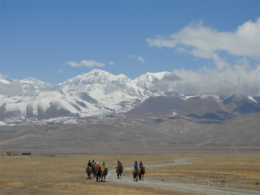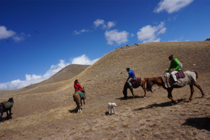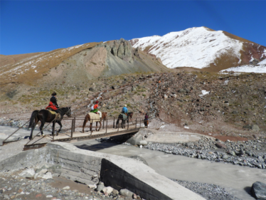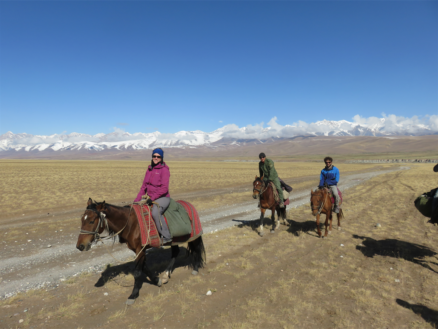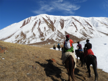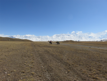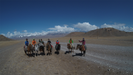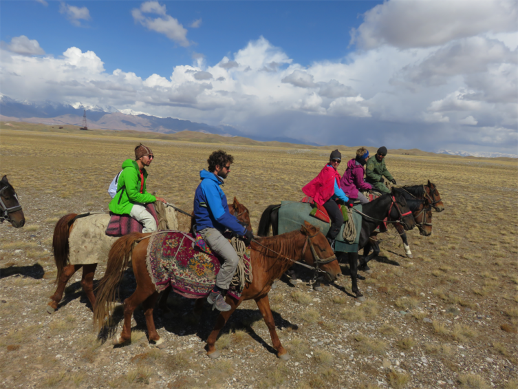 Finalement, ça sera trois jours au pied du camp de base du pic Lénine ! La première journée est consacrée au trajet Sary Mogol – Tulpar lake, avec une traversée de la steppe ! L’occasion de retrouver d’anciennes sensations d’équitation pour Steph, Gabriel et moi, et de s’y mettre doucement pour Baptiste, Claude et Johanna ! Bientôt tout le monde trotte gentiment.