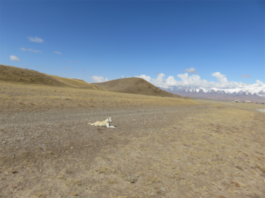 On re-dort dans notre guesthouse favorite, et le lendemain, c’est déjà le départ de cyclistes, accompagnés de la chienne Côtelettes qui ne les quitte plus ! Cette chienne suit des cyclistes depuis le pamir sur des centaines de km, et les copains ont fini par s’y attacher et la faire vacciner pour qu’elle puisse passer la frontière chinoise avec eux !