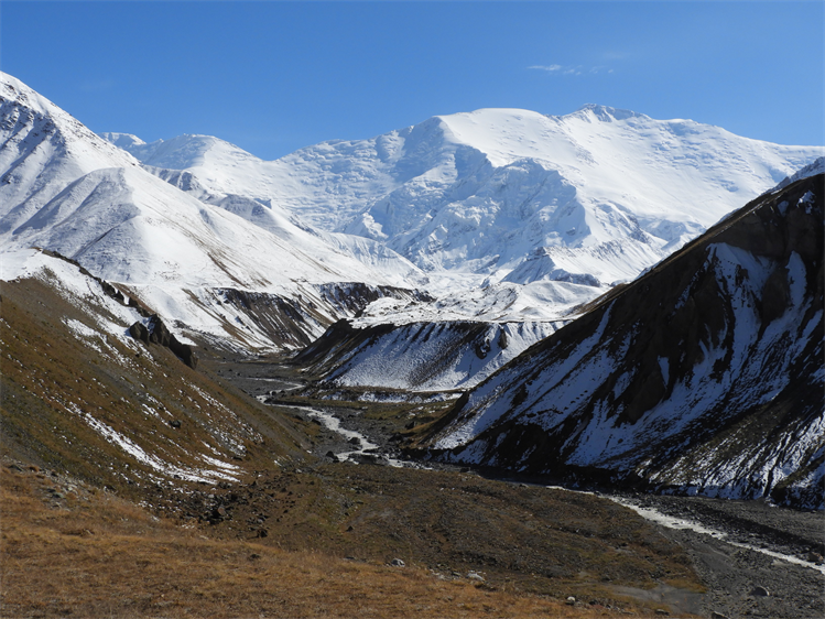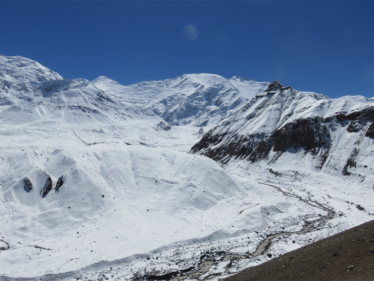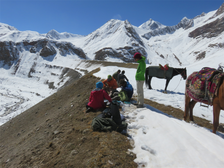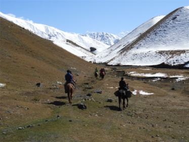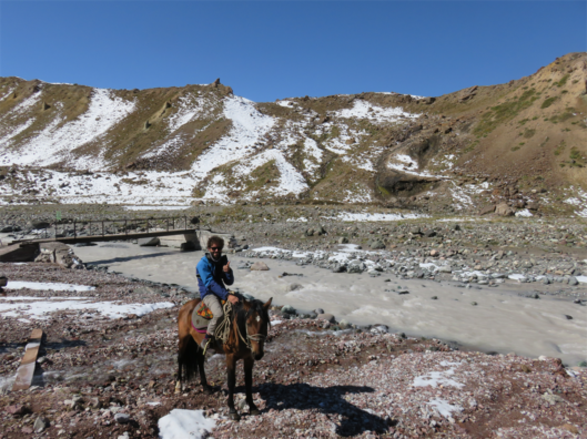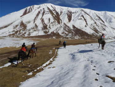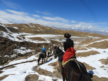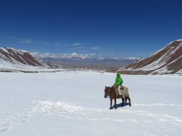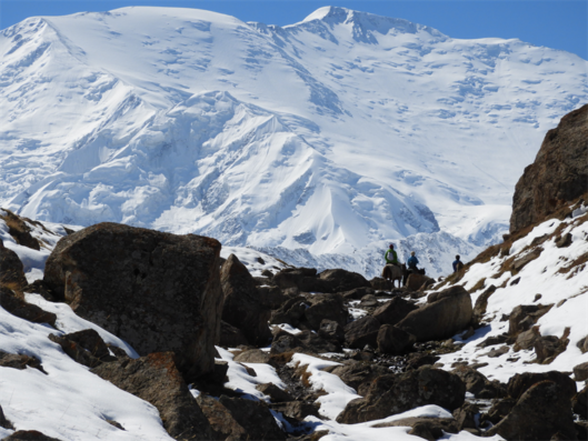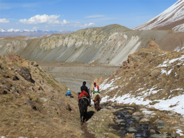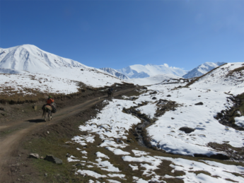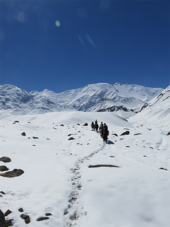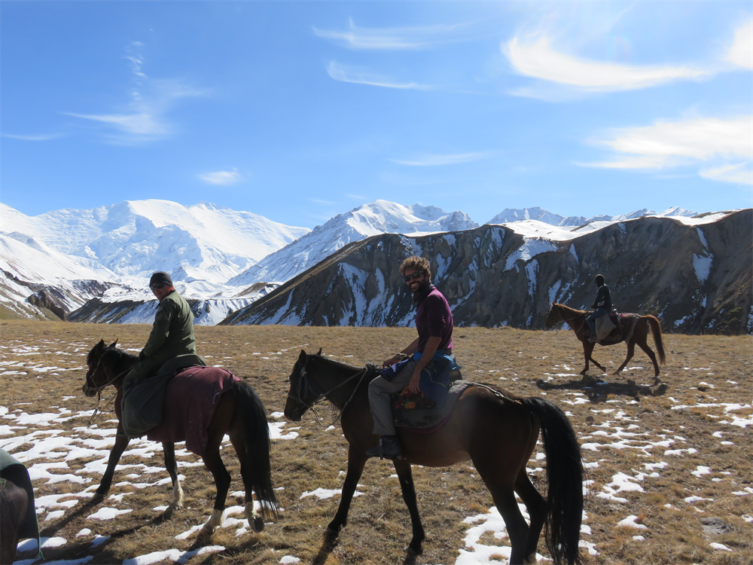 Le lendemain, on s’apprête à se mettre en route pour se rapprocher du Traveller’s pass, quand Stéphanie se bloque le dos… On doit donc faire cette journée sans elle, en espérant qu’elle arrivera à récupérer pour profiter de la dernière journée… La montée vers le traveller’s pass est intégralement dans la neige, on est contents d’être à cheval et pas à pied ! On passe à côté du camp de base déserté pour la saison et on est dans une grande vallée toute blanche majestueusement dominée par le pic Lénine ! C’est magnifique. On avance bien, jusqu’à un moment où la pente se raidit et les guides décrètent qu’on n’ira pas plus loin avec les chevaux qui risqueraient de tomber. Ce n’est pas grave, on en a déjà eu plein les yeux !