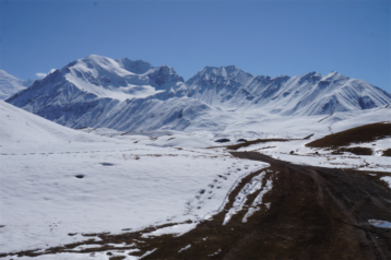 Sur la route du col on croise des militaires fusil en bandoulière par groupes de deux : le premier groupe nous ignore, le 2ème veut faire des selfies avec nous, le 3ème demande nos papiers (on s’en sort en sortant des photocopies de passeport)… Et en haut on tombe sur le chef, sympathique mais toujours fusil en bandoulière, qui nous propose à manger et fait un rapport ! On prend quand même quelques photos du Jiptik pass avant de redescendre pour s’éloigner de tous ces fusils !