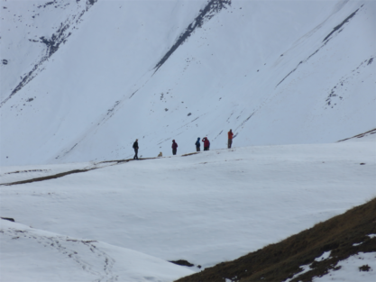 De notre côté, pour ne pas rester sur place, on se met en route vers le Sary Mogol pass (4303 m). On monte en longeant un canyon spectaculaire et on passe la nuit à 3700m, et le lendemain on se réveille sous la neige de la nuit ! Elle fond très rapidement au soleil, on poursuit notre chemin vers le col d’où on aperçoit d’adorables lacs ! C’est aussi le point culminant de notre voyage jusqu’à présent, on est fiers d’y être arrivés à pied ! On redescend vite pour être rentrés pour le dîner. Ça fait bizarre d’être à la guesthouse sans les copains ! On espère que vous faites bonne route !