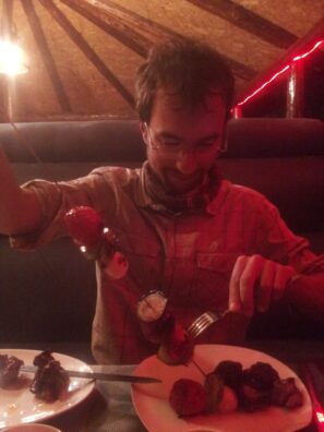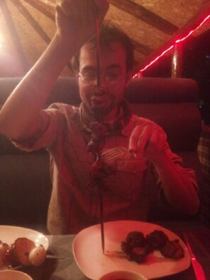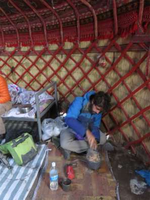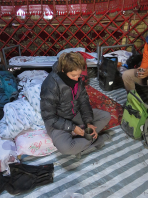 Il neige toute la nuit et le lendemain on reste bien au chaud dans la guesthouse en attendant Johanna… qui arrive comme prévu le soir même, avec ses sacoches remplies de cadeaux ! En particulier du saucisson et du fromage… C’est bombance !