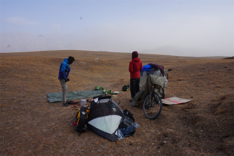 Après la frontière chinoise, nous avons donc fait demi-tour jusqu’à Sary-Tash. Nous testons la carriole avec le vélo de Johanna mais elle bouge dans tous les sens (pour les physiciens, on est devenus des pros de l’instabilité de la valise !), l’attache se casse… On essaie d’y mettre Côtelette mais elle s’enfuit dès qu’on la lâche. Finalement, on abandonnera la carriole à Sary-Tash : elle nous empêche d’aller vite et en l’état, il semble impossible que la chienne s’y habitue… On est ultra déçus, Claude avait fait un super boulot !!