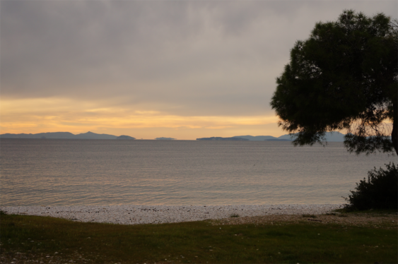Nous empruntons un deuxième bac pour quitter Salamine qui nous ramène à l’ouest de l’Attique dont nous longeons la côte pour atteindre le Péloponnèse. La vue sur la baie est absolument superbe, on peut y voir une succession de reliefs au delà des îles, les couchers de soleil encore précoces sont particulièrement appréciables.