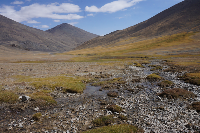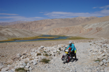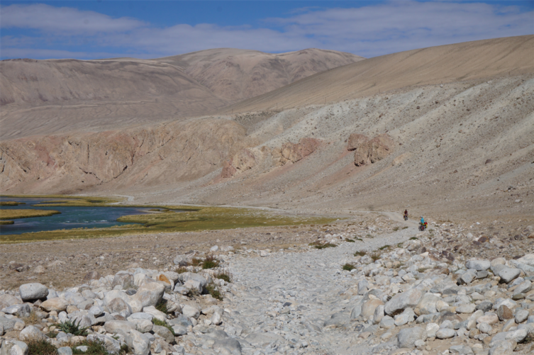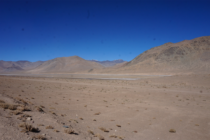 Nous repartons sur la route pour rencontrer le vent, nous roulons jusqu’à trouver de l’eau et il nous arrive une drôle d’expérience. Nous sommes à la recherche d’eau claire (en gros une rivière sur deux est boueuse, ça dépend de ce qui se trouve sur le chemin en aval du glacier), et nous rencontrons un lit asséché, mais avec le reflet de l’eau bien visible un peu plus haut. Je descends pour aller voir de plus près si l’eau est claire, et il s’avère que la rivière est en train de se remplir ! Ce n’est pas dû à un barrage, mais simplement le soleil fait fondre le glacier en journée, et nous nous trouvons exactement au bon moment au bon endroit en aval ! Notre source d’eau fraiche et claire est donc trouvée pour la nuit et nous plantons la tente.