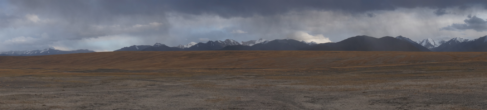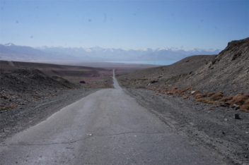 Pour arriver à Sary Tash nous devons traverser une plaine gigantesque encaissée entre deux immenses chaînes de montagnes, celle d’où nous venons et celle au pied de laquelle se trouve la ville. Notre jolie plaine est balayée par un vent d’est assez puissant. Il nous vient de côté au départ, mais petite à petit nous l’aurons de plus en plus en face, et les derniers kilomètres pour arriver à Sary Tash sont difficiles. Nous arrivons à la tombée de la nuit dans une guest house moyenne qu’on nous avait conseillée.