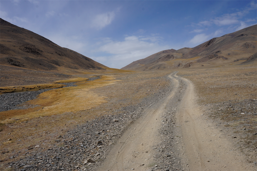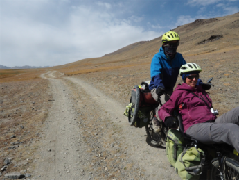 Durant tout notre trajet, cette chienne vélociphile nous suit avec enthousiasme ! Elle est super intelligente, se met toujours du bon côté de la route lorsqu’une voiture arrive de face ou de derrière, et vu notre vitesse elle nous suit sans difficulté… Après quelques kilomètres on essaye de la décourager de nous suivre, car on va loin et que la route ça reste un peu dangereux… Mais il est impossible de s’en débarrasser ! Petit à petit on s’habitue à la voir dans notre rétroviseur, quand elle s’éloigne un peu trop une côte ou une bourrasque lui permet de nous rattraper sans problème. Les kilomètres défilent et on se dit que vraiment, elle marche bien cette chienne. Elle arrive à Sary Mogol en même temps que nous et on commence à se dire que la route des deux Sary est peut être une habitude pour elle.