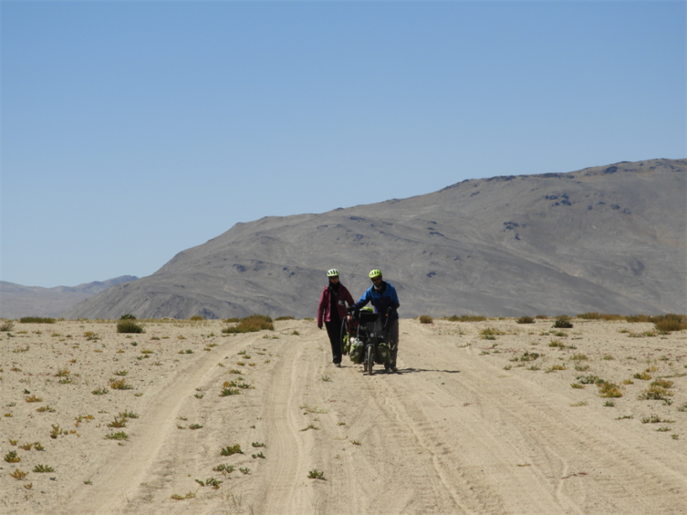 Nous prenons donc la route pour une toute petite étape : 35km de descente douce. Mais, ahah !, c’était oublier notre ami le vent ! Et oui, cette fois le vent vient de l’ouest, histoire qu’on l’ait encore dans le visage !! Et il ne rigole pas ce vent, on est réduit à du 6km/h par moment… (on mettra finalement 4h au total)